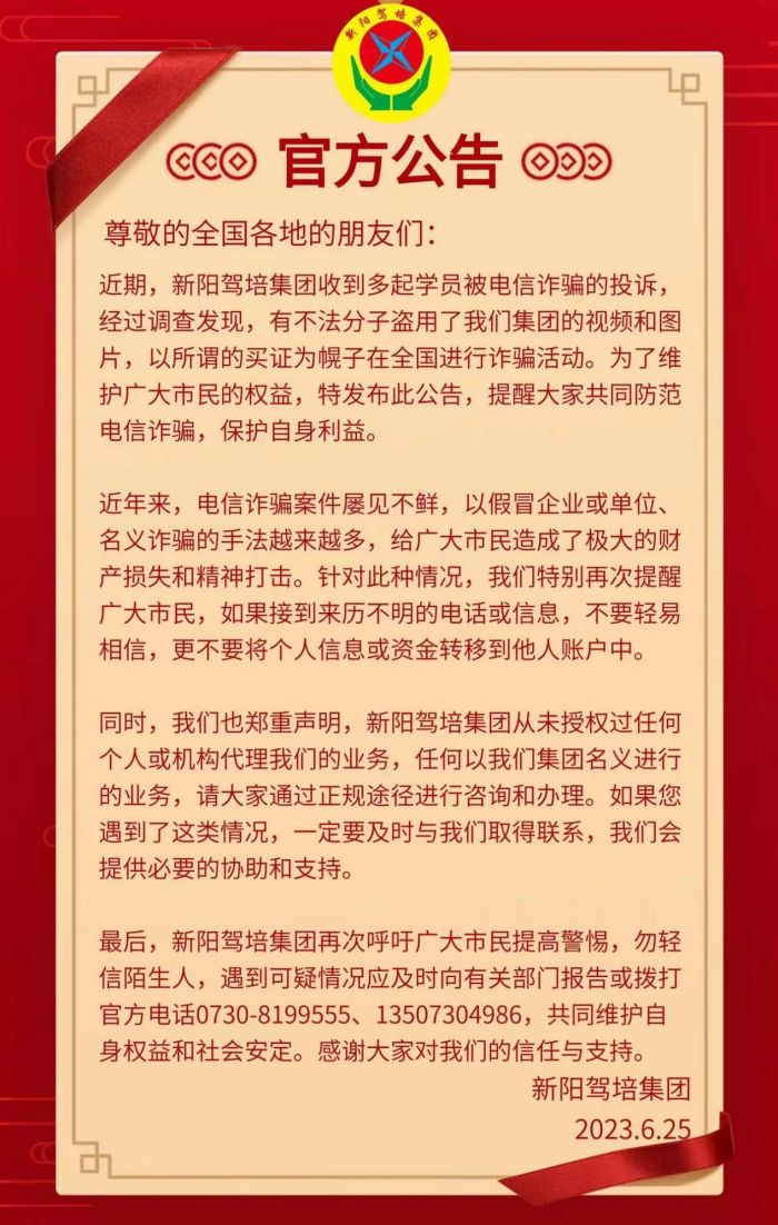 最后,新陽駕培集團(tuán)再次呼吁廣大市民提高警惕,勿輕信陌生人,遇到可疑情況應(yīng)及時(shí)向有關(guān)部門報(bào)告,共同維護(hù)自身權(quán)益和社會(huì)安定。感謝大家對(duì)我們的信任與支持。
